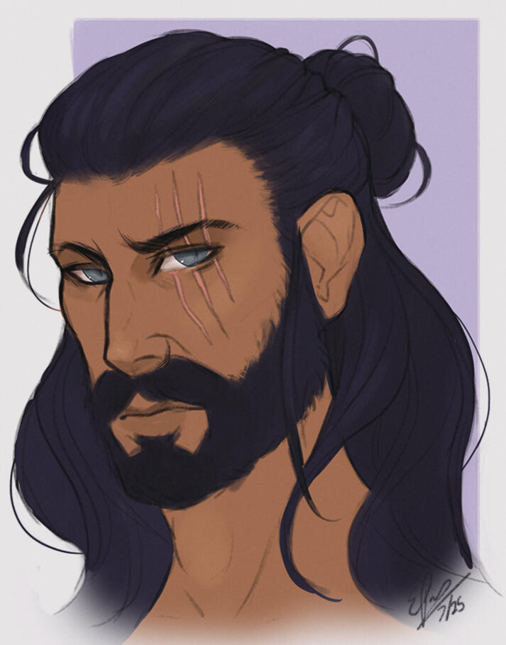 Name: Azuran Mal'arn.Alias: The Silver Drake.Culture / Race: Fireborne Half-Greatling.Age: 35 Years Old.Sexuality: Demisexual.Marital Status: Engaged.Height: 8'0.Hair: A deep, Raven-black hue, it is Long and often tied back in a bun.Eyes: A vibrant, striking silver.Voice: A deep, Rumbling tone.Appearance: A large, stoic figure often heavily armored. Silver, draconic wings sprout from his back, alongside a pair of horns that extend from the sides of his head.
